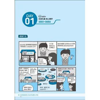 每日學習內容開頭提供一則短篇生活情境漫畫,劇情對話皆改寫自實際多益出現過的句子,以中英夾雜融合該單元英文單字,快速導入學習內容,畫風詼諧有趣,幫助學習前輕鬆暖身!